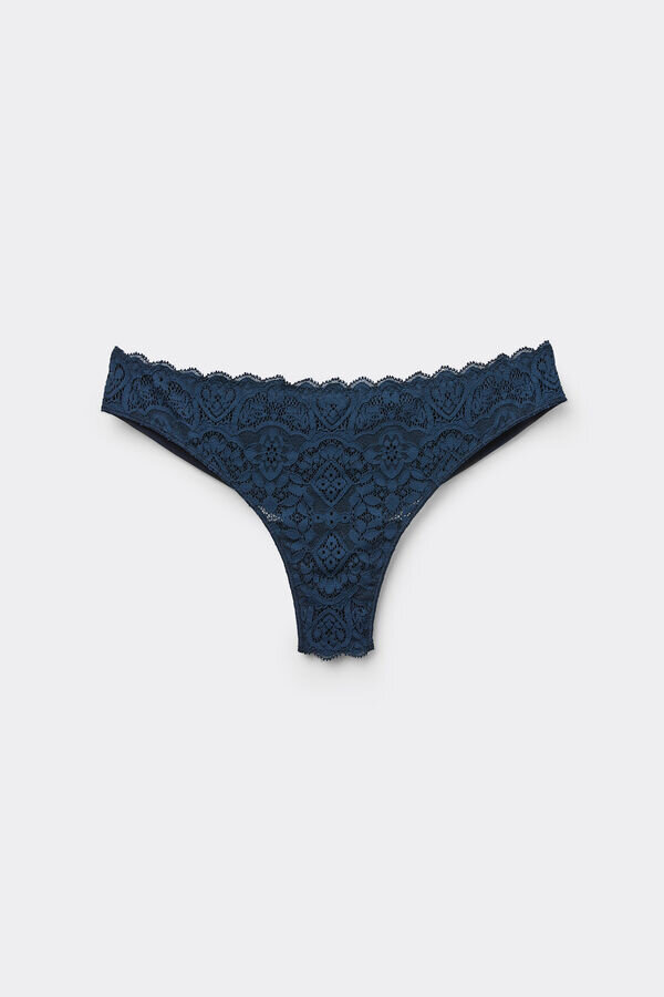 Tutustu Intimissimiin Brazilian pitsi- ja mikrokuitupöksyihin, joissa on joustavaa pitsiä geometrisella kuviolla, romanttisia röyhelöitä ja pehmeä kaksikerroksinen mikrokuitupohja.