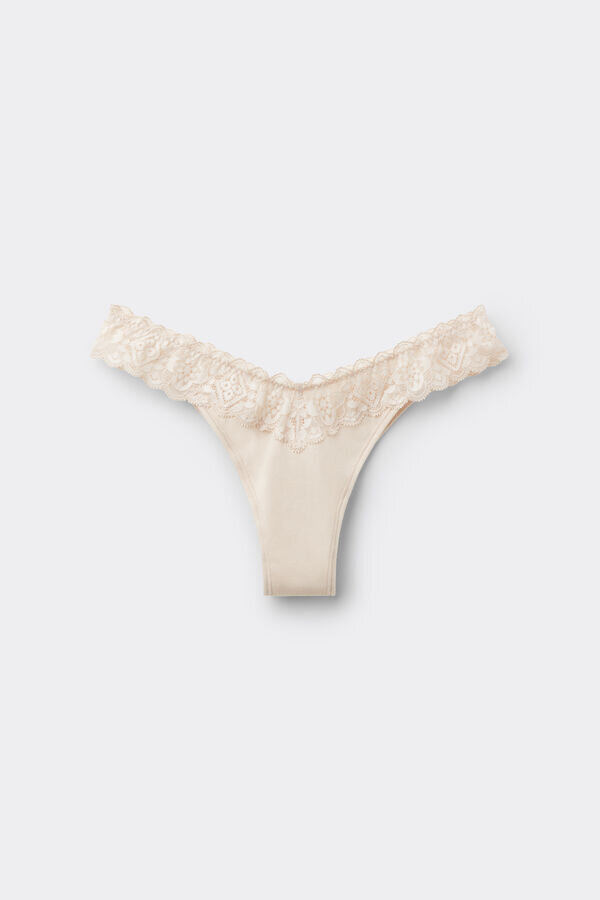 1980-luvun tyylinen Brazilian alusvaate, valmistettu kevyestä, joustavasta pehmeästä puuvillasta, pitsi vyötärönauhalla. 100 % puuvillaa sisäosassa