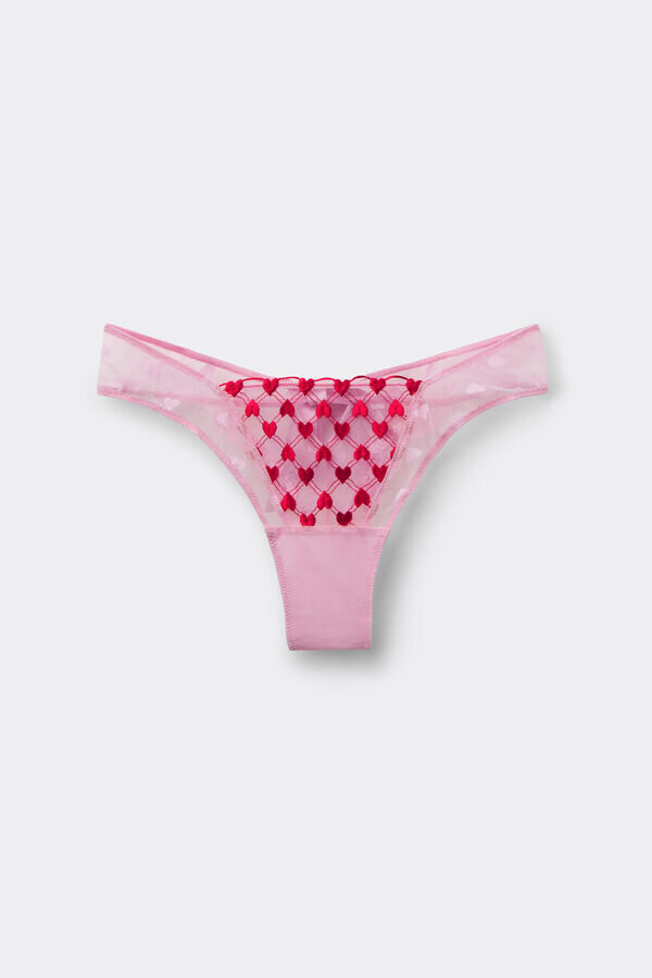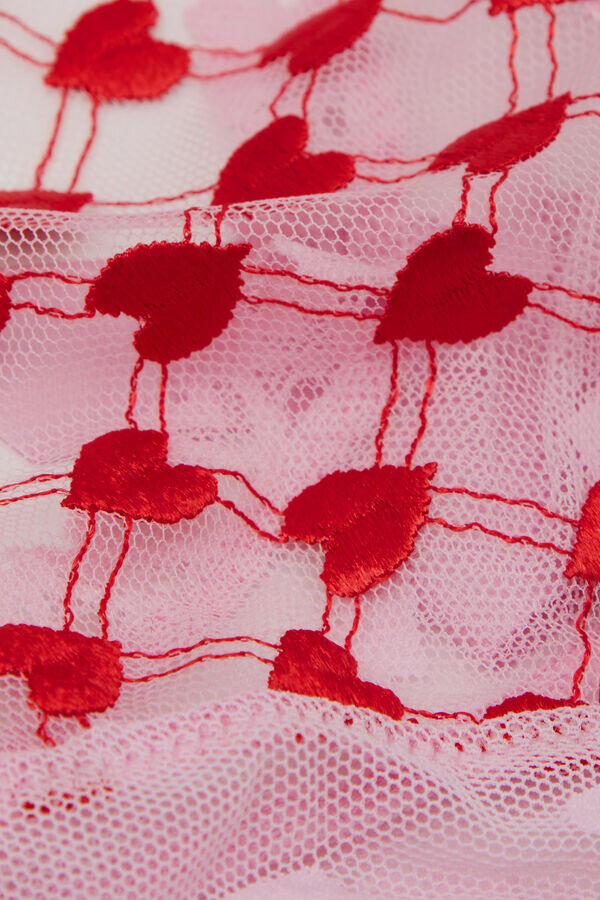 romanttinen Brazilian-tyylinen rintaliivi, jossa on sydämenmuotoinen brodeeraus ja takana sydämenmuotoinen röyhelö ja satiinikoristeet. satiininen olkaimet ovat irrotettavat ja niitä voi käyttää myös leikkisänä kaulakoruna tai hiuskoristeena.