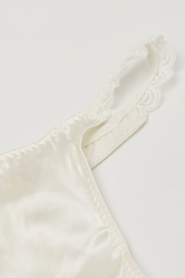 silkkinen G-string, jonka sivuilla on pitsi-insertit. puuvillainen sisäosa.