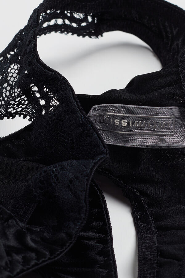 silkkinen G-string, jonka sivuilla on pitsi-insertit. puuvillainen sisäosa.