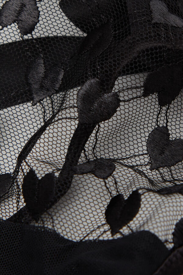 Thong romanttisella sydänbrodeerauksella ja aistillisella satiinireunuksella. satiininen hihna on irrotettava ja sitä voi käyttää myös ilkikurisena kaulakoruna tai hiuskoristeena.