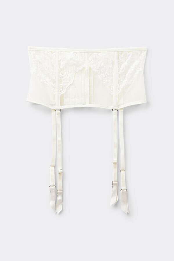 korsettityylinen sukkanauha silmäripsipitsiä ja tylliä, jossa on aistilliset mikrokuitupäällysteiset luut. Se muuttuu glamouriseksi asusteeksi, kun sitä käytetään paidan tai tiukan topin päällä.