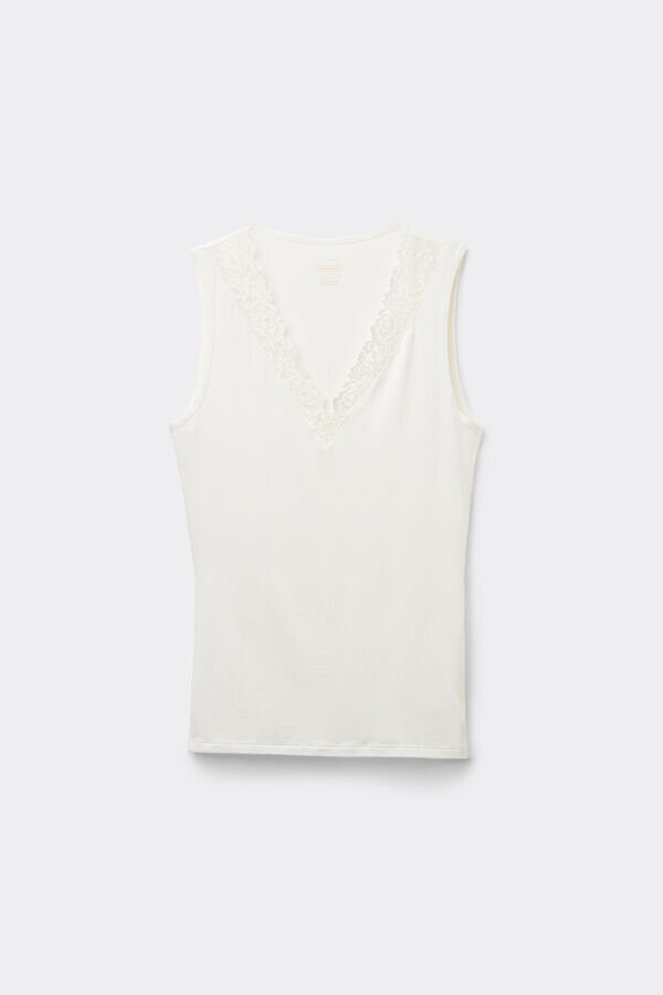 pehmeä modaalinen tankkitoppi, jonka kaula-aukko on koristeltu elegantilla kukka-aiheisella pitsirypistyksellä.