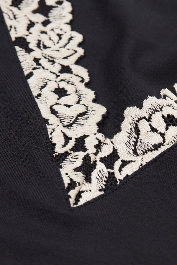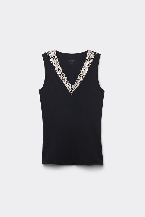 pehmeä modaalinen tankkitoppi, jonka kaula-aukko on koristeltu elegantilla kukka-aiheisella pitsirypistyksellä.