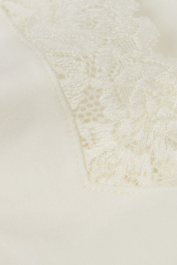 V-kaula-aukkoinen toppi, valmistettu modaalista ja koristeltu pitsirypistyksellä. Valitun värin mukaan pitsi voi olla kontrastivärinen tai sävy sävyyn. Ohut olkaimet, vuorattu mikromodaalilla.