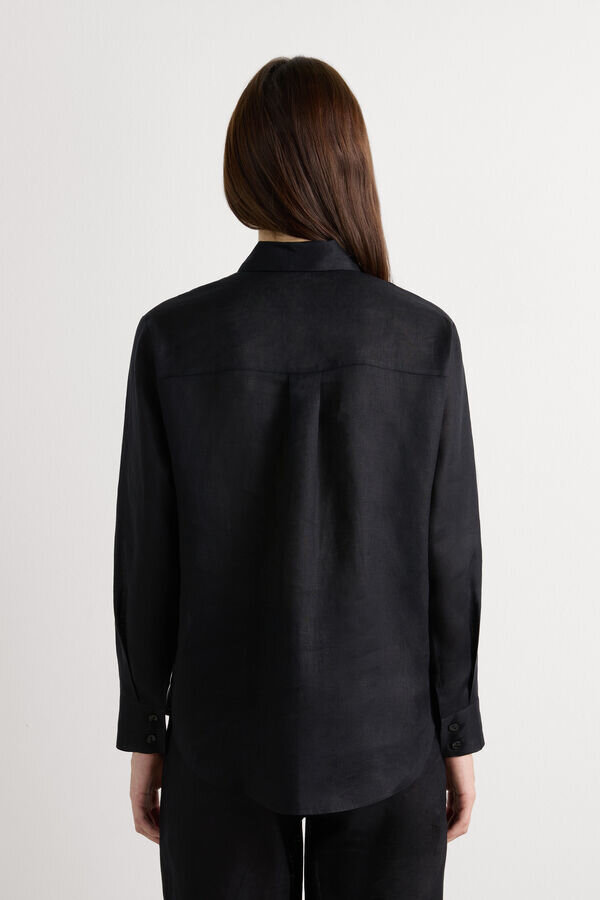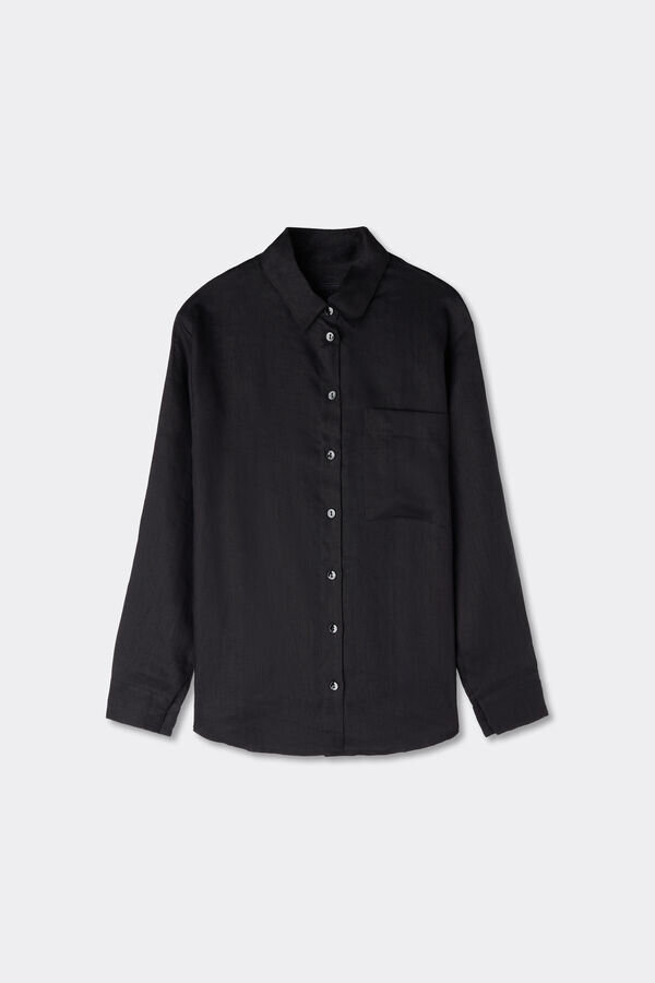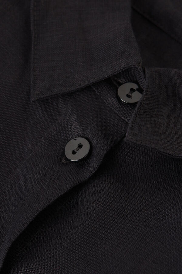 pellavakankaasta valmistettu paita, jossa on etutasku ja hihansuut.