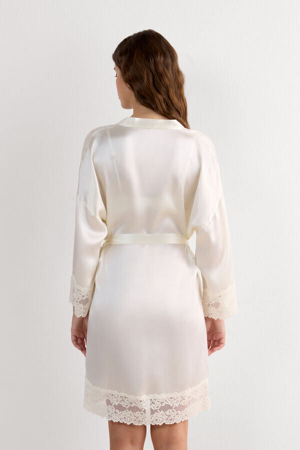 tyylikäs ja hienostunut silkkikimono, jossa on kaunis pitsi-röyhelöreunus.