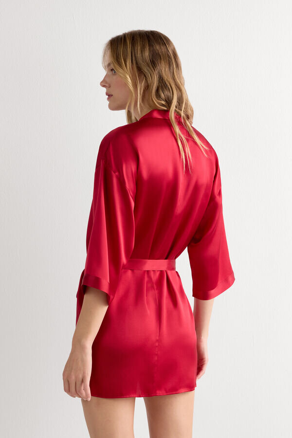 silkkikimono, jossa on 3/4-hihat. Sisäpuolella nauhoitus, joka luo ristikkäisen tyylin, ja vyö, jossa on kaksi silmukkaa. Malli on 175 cm pitkä ja käyttää kokoa S.