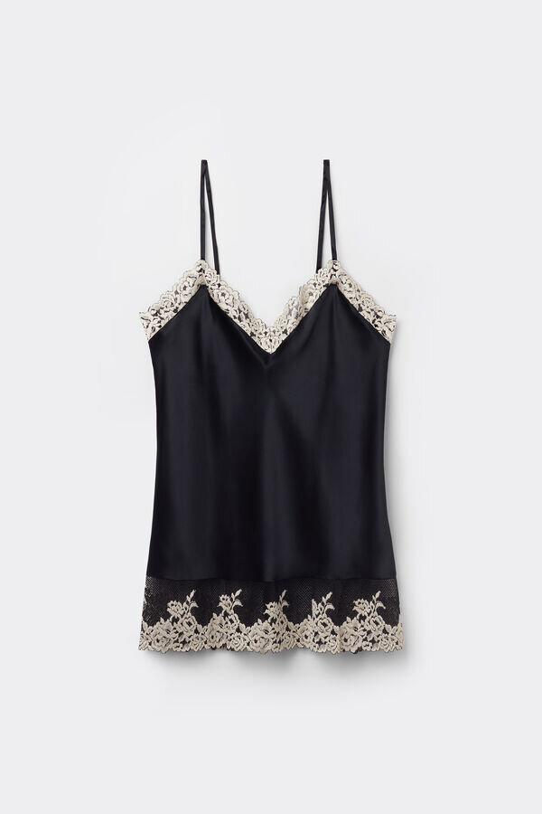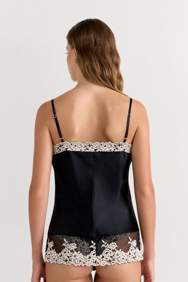 silkkisatiininen toppi, jossa on edessä ja takana V-aukko, koristeltu pitsi-inserttien kanssa kaula-aukolla ja helmassa. valitun värin mukaan pitsi voi olla kontrastivärinen tai sävy sävyyn. täysin säädettävät, ohuet silkkiset olkaimet. normaali istuvuus.