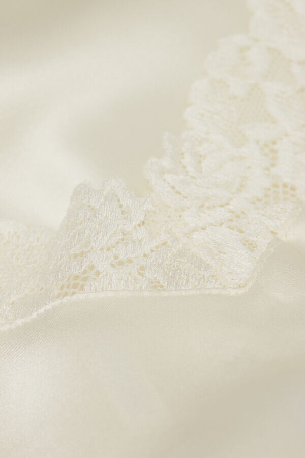 silkkisatiininen toppi, jossa on edessä ja takana V-aukko, koristeltu pitsi-inserttien kanssa kaula-aukolla ja helmassa. valitun värin mukaan pitsi voi olla kontrastivärinen tai sävy sävyyn. täysin säädettävät, ohuet silkkiset olkaimet. normaali istuvuus.