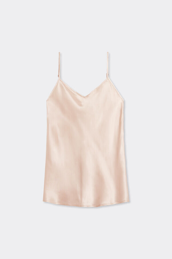 silkkisatiininen toppi, jossa on V-aukko edessä ja takana. säädettävät ohuet olkaimet.