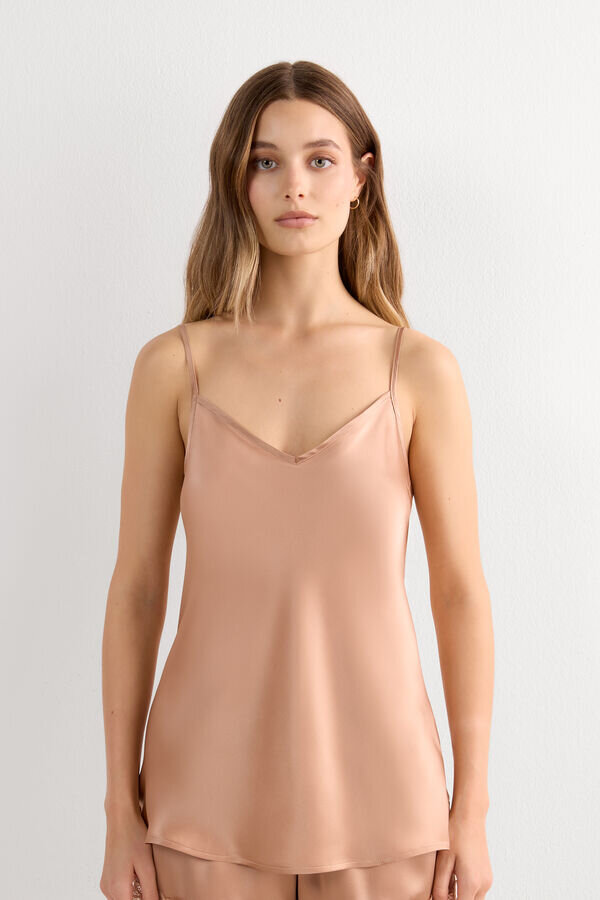silkkisatiininen toppi, jossa on V-aukko edessä ja takana. säädettävät ohuet olkaimet.