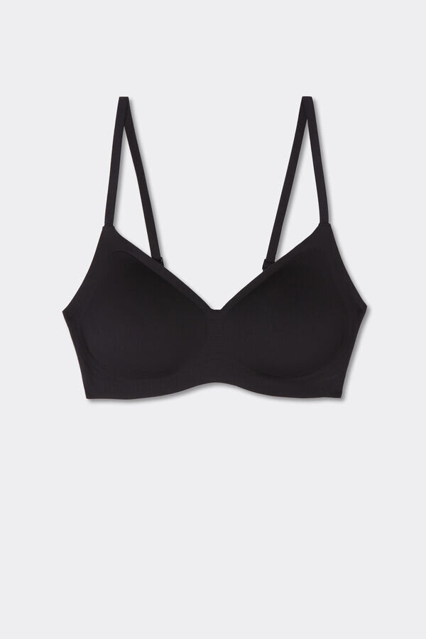 pehmeä mikrokuituinen rintaliivi, saumaton, joten se ei näy vaatteiden alla. V-kaula-aukko ja ristikkäiset olkaimet takana. Lisää volyymia asettamalla mukana tulevat puolikuun muotoiset pehmusteet kuppien sisään. Mukava ja pehmeä, tukee rintaa ilman puristusta.